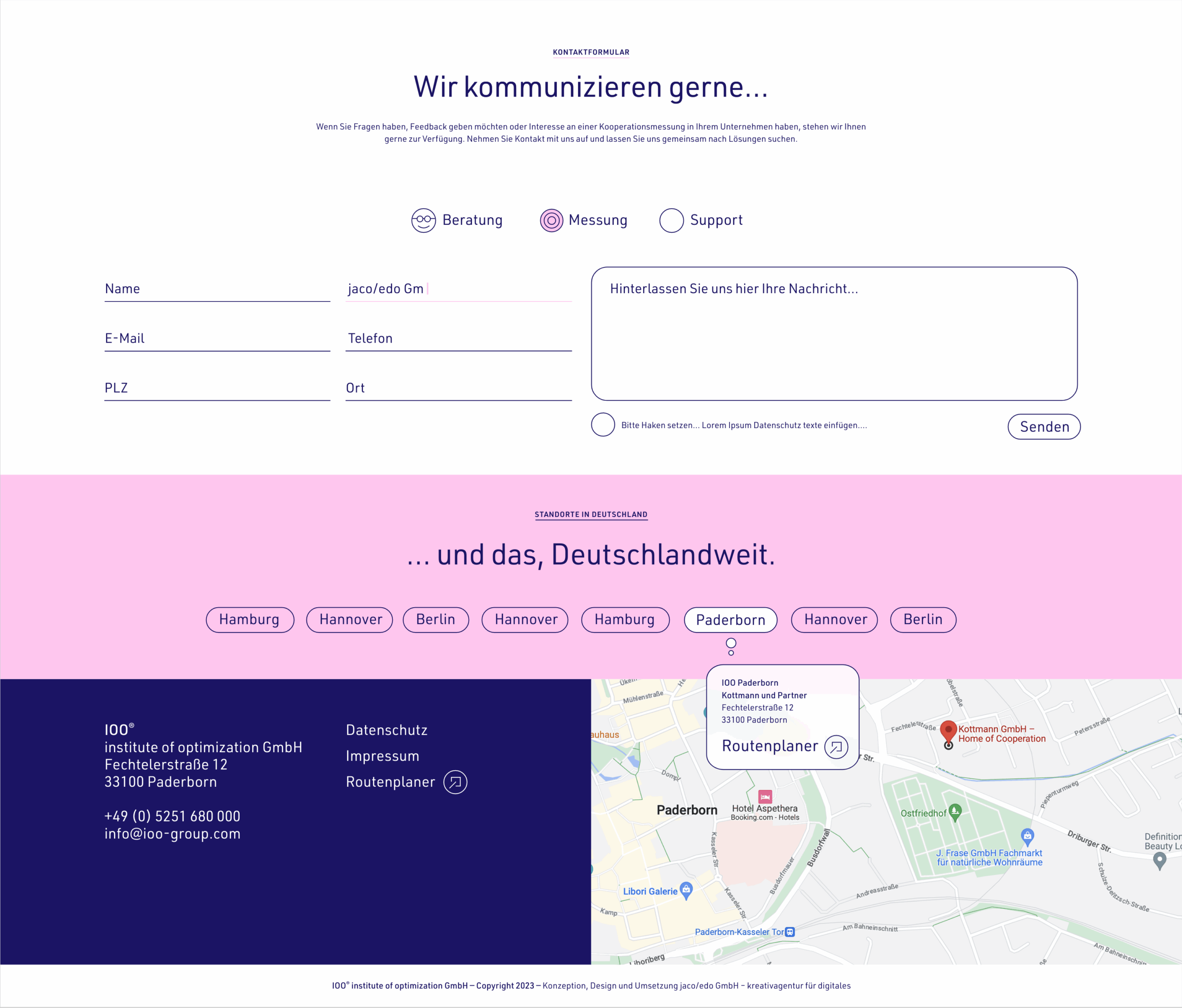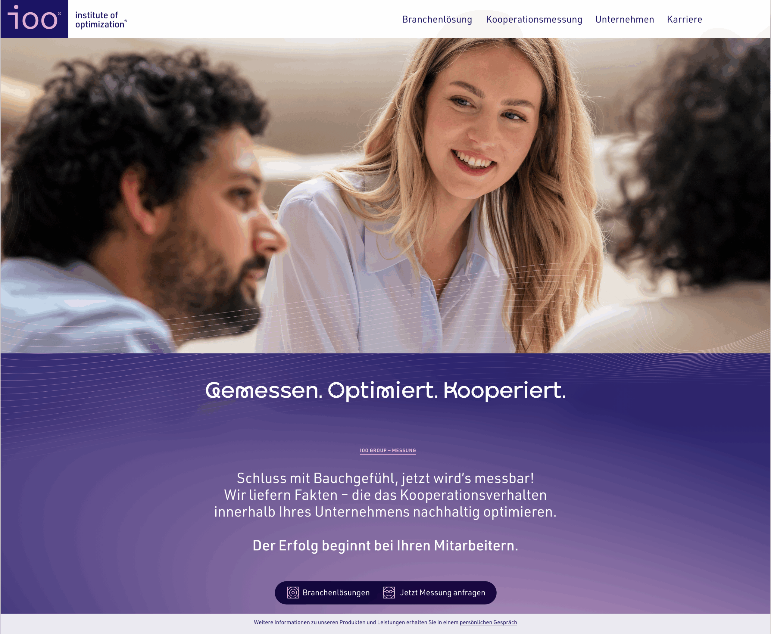 Aus einer einfachen Kooperationsmessung ist ein eigenständiges Unternehmen entstanden: das ioo – Institute of Optimization. Wir haben den gesamten Prozess begleitet – von der Namensentwicklung über die Markenidentität bis hin zur vollständigen Positionierung.